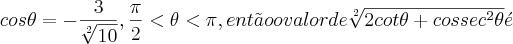 Primeiro você tem que encontrar sen \theta . Usando a propriedade fundamental: sen^2 \theta+cos^2 \theta=1\,\Rightarrow\,sen^2 \theta+(- \frac{3}{\sqrt{10}})^2=1 \Rightarrow\,sen^2 \theta+\frac{9}{10}=1\\ \Rightarrow\,sen^2 \theta=1-\frac{9}{10}\,\Rightarrow\, sen^2 \theta=\frac{1}{10}\,\Ri...