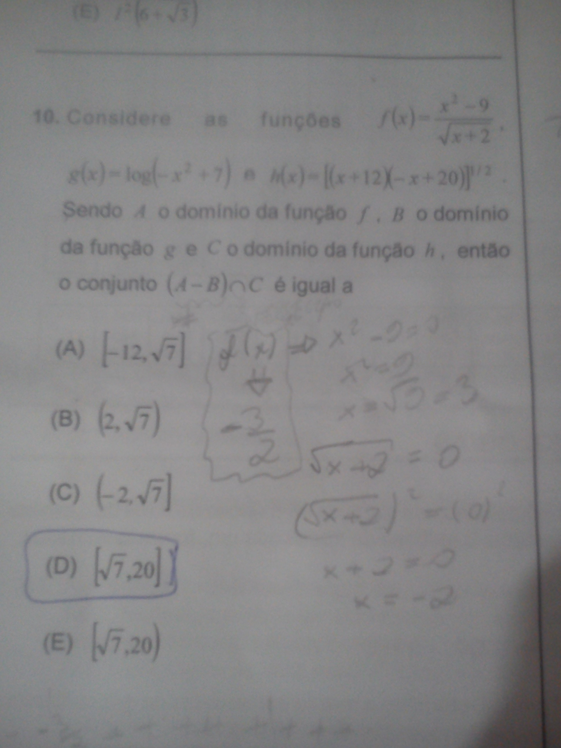 Consegui encontrar f(x) que é o conjunto A, g(x) que é o conjunto B porém para encontrar h(x) resulta em uma equação de 2º grau da seguinte forma como é apresentada na fotografia mas vou por aqui tbm h(x) = [( x + 12)( -x +20)]¹/². Após resolver a multiplicação entre parênteses achei a equação e resolvi achando as 2 raízes. A dúvida é o que faço com o expoente 1/2 após resolver a equação?