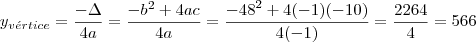 Seja a parábola y(x) = a{x}^{2} + bx + c. O valor de x tal que ela se extremiza, isto é, atinge valor máximo ou mínimo é dado por x = \frac{-b}{2a}. Este valor é calculado por y(x) =\frac{-\Delta}{4a}.