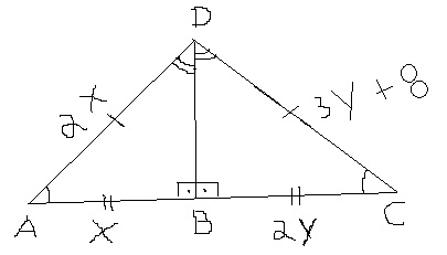 Na figura, o triângulo ABD é congruente ao triângulo CBD. Sabendo que AB = x, BC = 2y, CD = 3y + 8 e DA = 2x, calcule x e y.