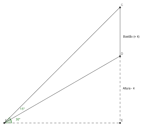 De um ponto A no solo, visam-se a base B e o topo C de um bastão colocado verticalmente no alto de uma colina, sob um ângulo de 30º e 45º, respectivamente. Se o bastão mede 4 m de comprimento, a altura da colina, em metros, é igual a: