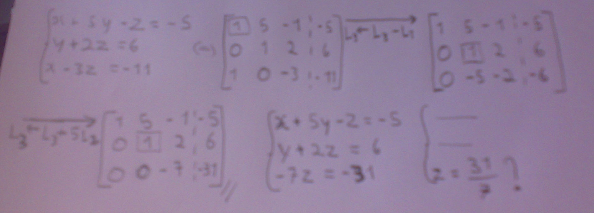 Eu tentei resolver da forma como está em anexo (Método de Eliminação de Gauss) mas onde estou eu a errar???