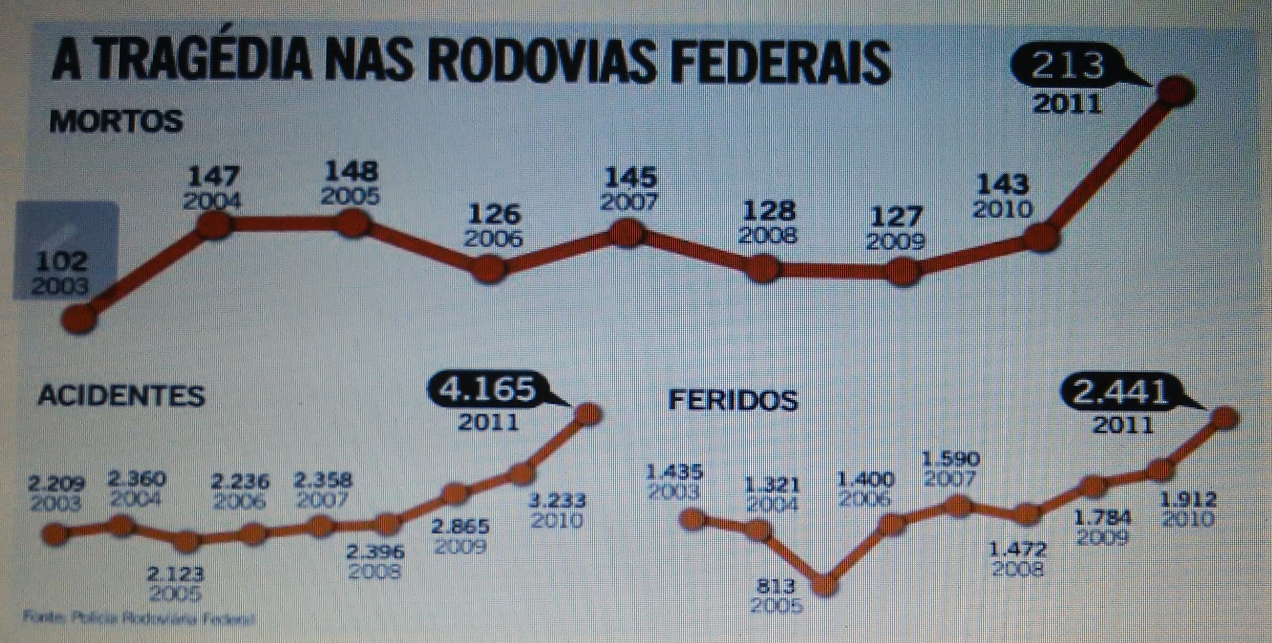 Questão 1. No Brasil, neste ano, aproximadamente 58 mil pessoas vão morrer em acidentes de trânsito. Segundo o Ministério da Saúde, com a “lei seca”, que impõe maior fiscalização e rigor aos motoristas que dirigem após ingerir bebidas alcoólicas, estima-se que esse número poderia passar de 70 mil mortes em acidentes de carros e motos. Os três gráficos abaixo representam o quadro da tragédia que ocorre em nossas rodovias federais, apresentando o número de mortes, acidentes e feridos ocorridos apenas no FERIADO DE CARNAVAL no período de 2003 a 2011.