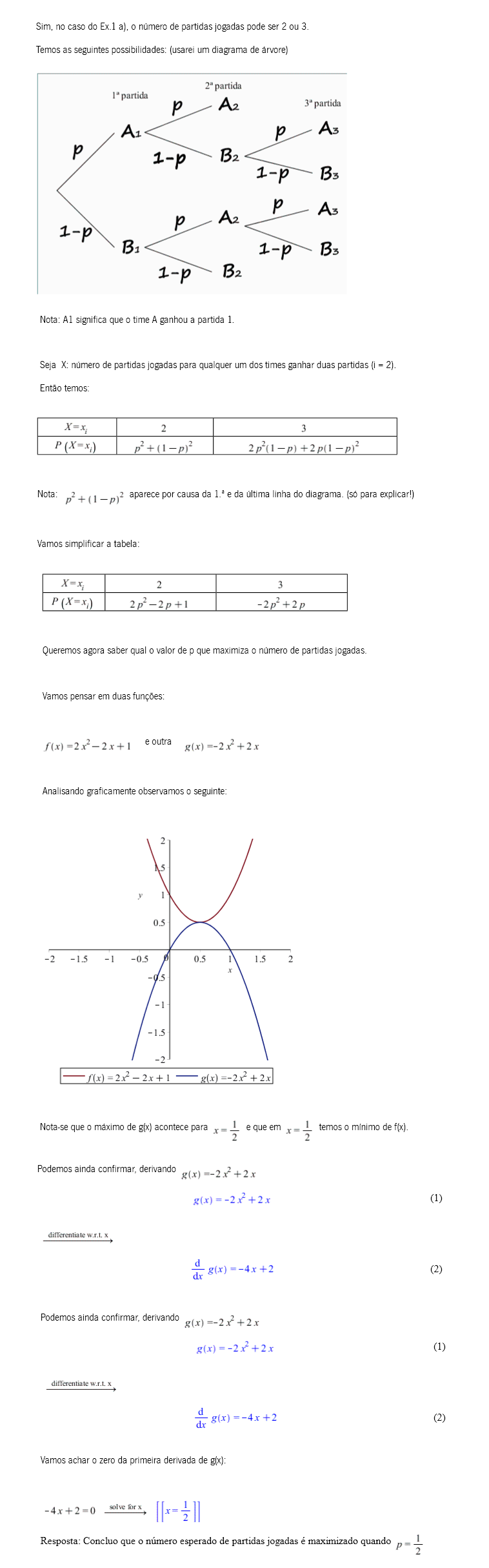 Comentário: Fica evidente que, por exemplo, para (a) a V.A. X (número de partidas jogadas) assume os valores 2 ou 3, com probabilidade p² e 2*p² *(1 - p). Contudo depois que que obtenho a função que representa a esperança, a maximização não fica claro para mim.