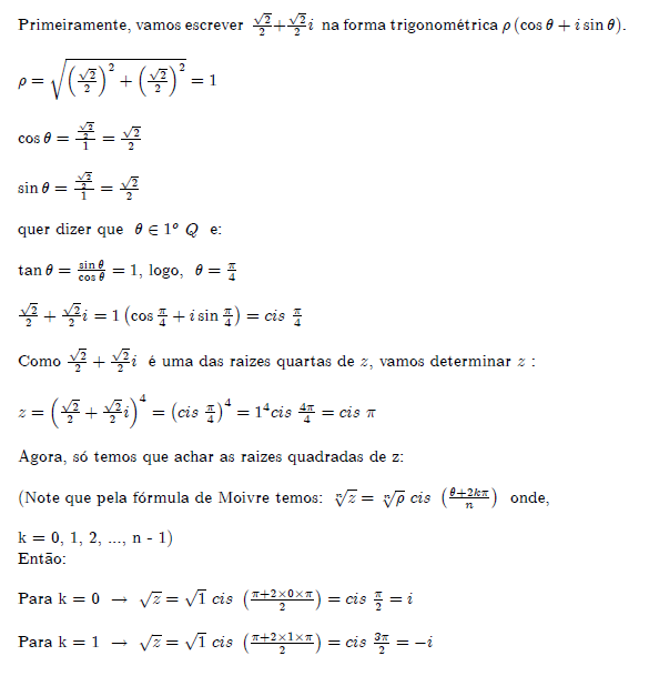 raízes quadradas do número complexo z. Mas eu não sei qual é o número complexo z...
