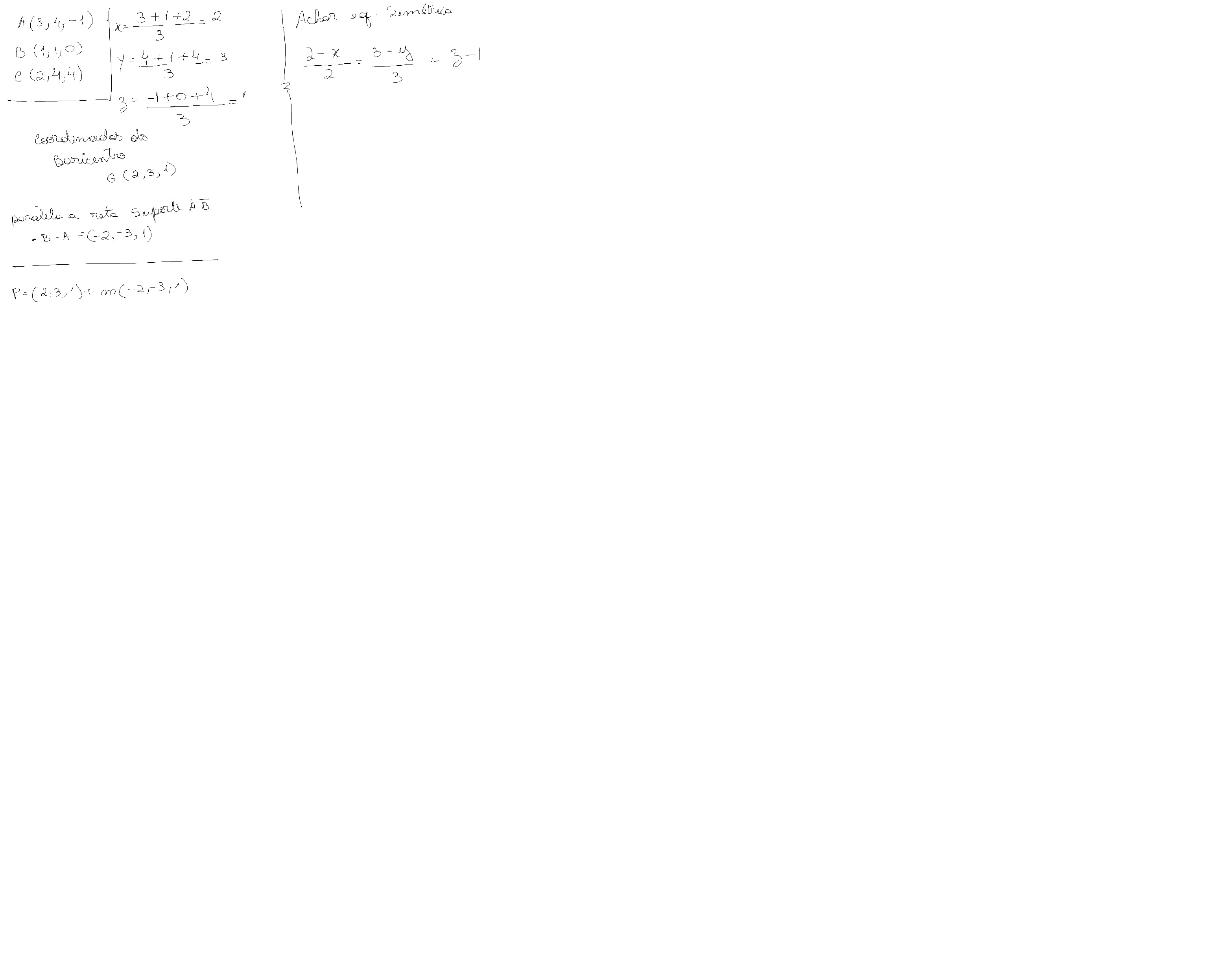 Determine as equações simétricas da reta que passa pelo baricentro do triângulo de
