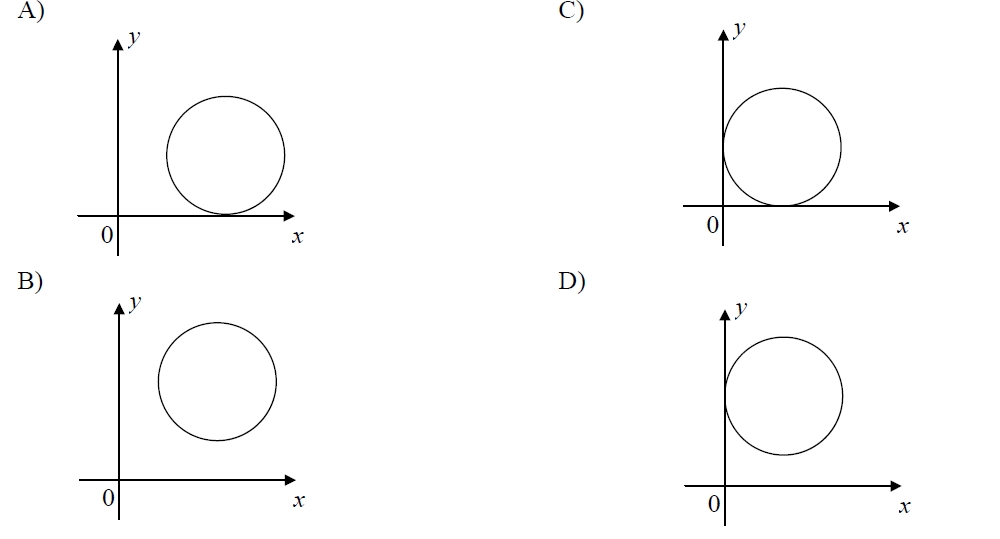 Como o raio é menor que a distância da abscissa ao raio e da ordenada ao raio, existe um espaço entre a abscissa e a circunferência e da ordenada à circunferência. A única circunferência com essas características é a B. Portanto, a respota é B.