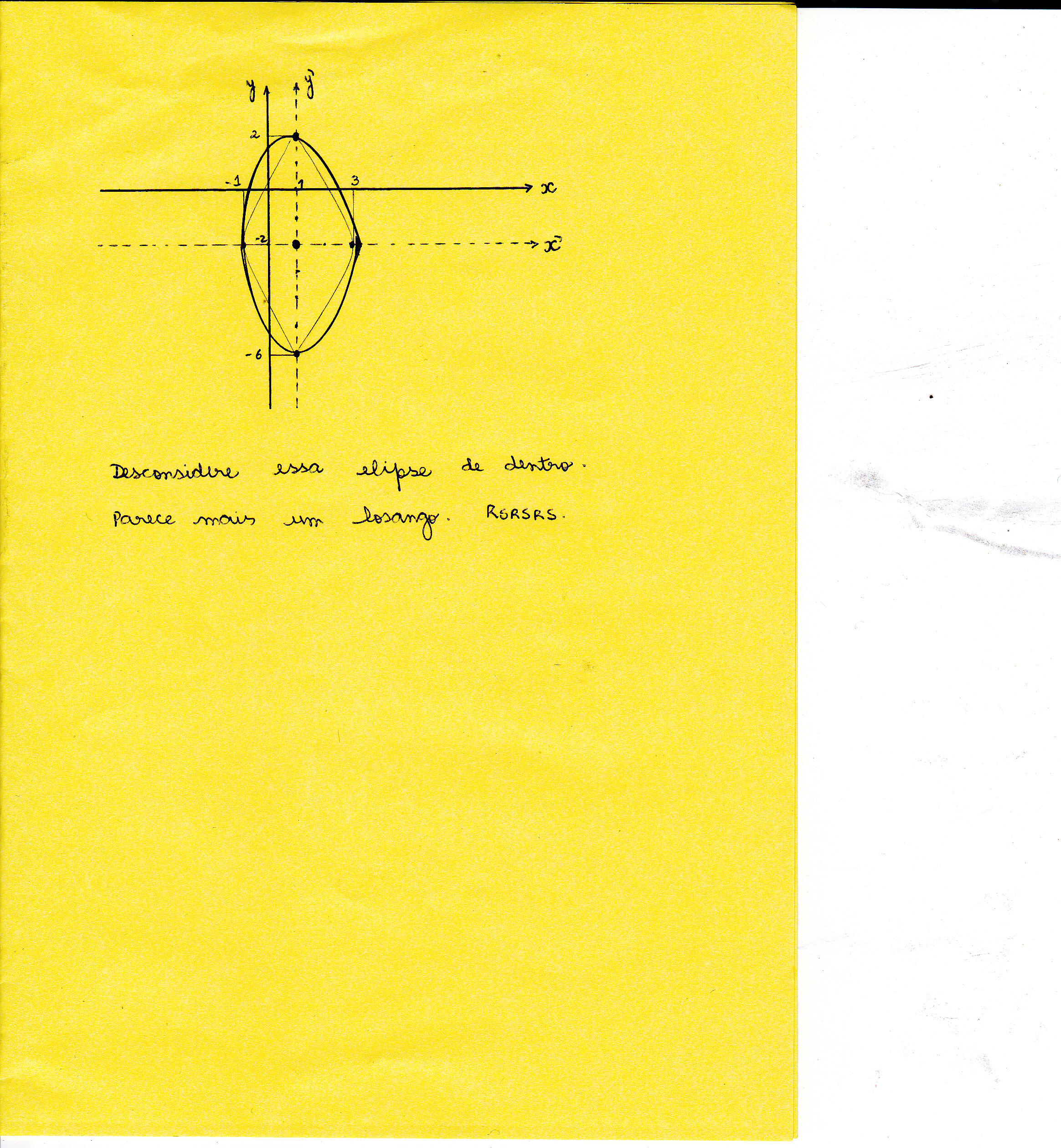 (- 1, - 2); (3, - 2); (1, 2) e (1, - 6)Vale rassaltar que, a elipse cujo denominador é maior terá eixo maior na variável do seu numerador; nesse caso, o eixo maior está em "y", por isso a equação será: