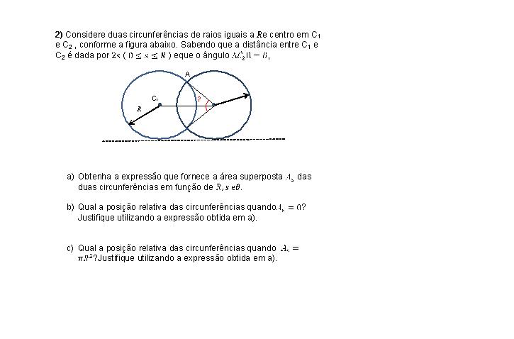 vanessa_mat escreveu:Considere duas circunferências de raios iguais a R e centro em C1 e C2 , conforme a figura abaixo. Sabendo que a distância entre C1 e C2 é dada por 2s ( 0?s?R ) e que o ângulo A(C_2 ) ?B=?,
