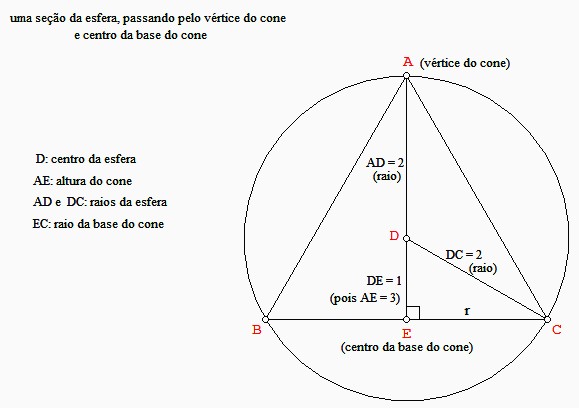 01. Um cone reto com altura medindo 3 está inscrito em uma esfera com raio medindo 2, como ilustrado a seguir: