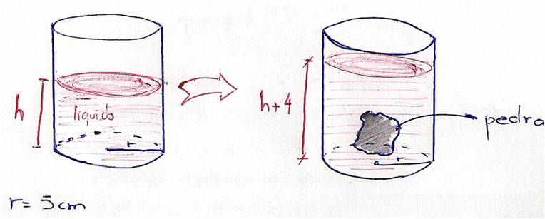 MERGULHANDO UMA PEDRA NUM RECIPIENTE CILINDRICO RETO, O NIVEL DA AGUA SOBE 4 CM. cALCULE O VOLUME DA PEDRA, EM CENTIMETROS CUBICOS, SABENDO QUE A BASE DO RECIPIENTE TEM UM RAIO DE 5 CM.