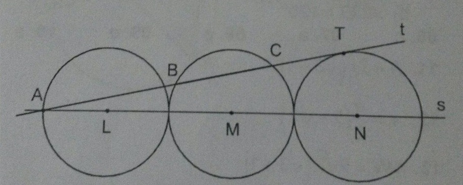 As circunferências da figura têm raios iguais a 5, seus centros estão na reta s e a circunferência de centro M tangencia as outras duas. A reta t é tangente à circunferência de centro N e passa pelo ponto A, em que a reta s intersecta a circunferência de centro L. Calcule o comprimento da corda BC, que a reta t determina na circunferência de centro M.