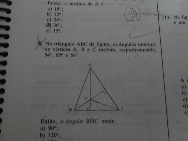 No triângulo ABC da figura, os ângulos internos de vértices A,B e C medem, respectivamente, 54º, 68º e 58º .Então, o ângulo B^HC mede :