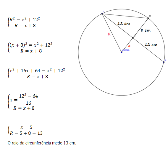Uma corda e um arco de uma circunferência de raio R são representados, respectivamente, por AB e ACB. A corda AB tem comprimento igual a 24 cm e D é seu ponto médio. Sabendo-se que o segmento CD = 8 cm é perpendicular à corda por D, determine a medida do raio da circunferência. Resposta: 13 cm