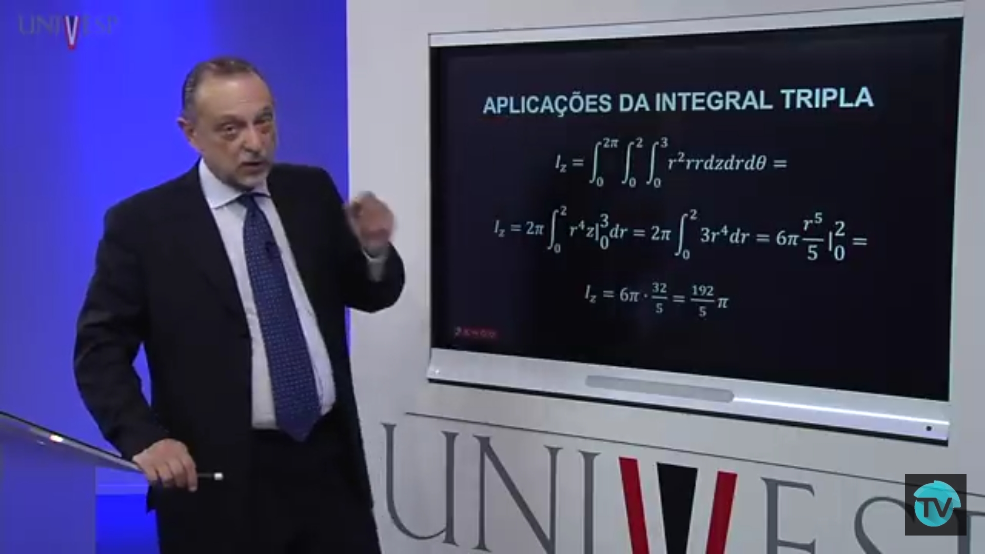 Exercício: Calcule o momento de inércia do cilindro x² + y² ≤ 4, 0 ≤ x ≤ 3, em relação ao eixo das cotas com densidade igual a raiz quadradada de (x² + y²):