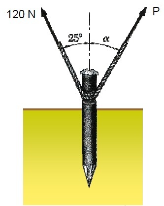 Uma estaca cravada no solo é solicitada por dois trechos de Resultante de Forças Concorrentes corda. Impondo que a resultante das duas forças aplicadas à estaca seja vertical, determine: