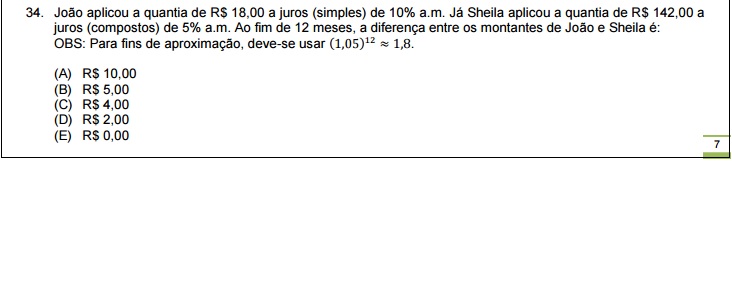 João aplicou a quantia de R$ 18,00 a juros (simples) de 10% a.m. já Sheila aplicou a quantia de R$ 142,00 a juros (compostos) de 5% a.m. Ao fim de 12 meses, a diferença entre os montantes de João e Sheila é: