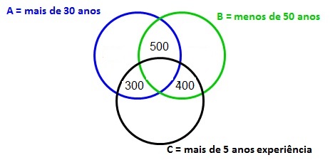 das 900 pessoas com menos de 50 anos 800 tambem tem mais de 30 anos e dessas 700 tambem tem mais de cinco anos de experiencia