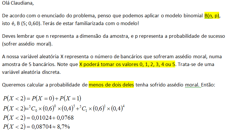 Segundo um estudo realizado pelo Sindicato dos Bancários, 60% dos bancários já sofreu algum tipo de assédio moral. Supondo que em setor do banco trabalham cinco bancários, a probabilidade de menos de dois deles tenha sofrido assédio moral é: