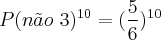 Suponha que tenhamos um dado honesto (dado de 6 lados) e voce joga 10 vezes. Qual é a probabilidade de não achar um '3' em nenhuma jogada?