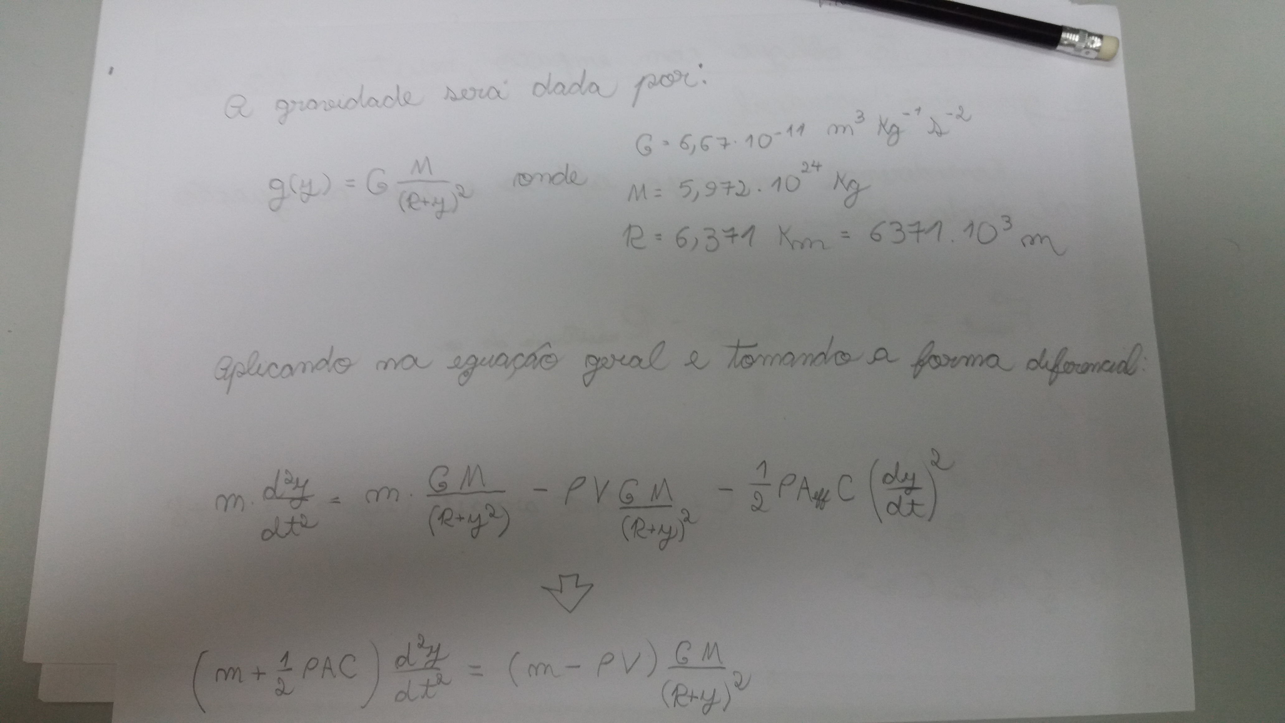 A proposta consiste em achar a equação de y(t) para um lançamento oblíquo considerando empuxo, resistência do ar e gravidade variável.