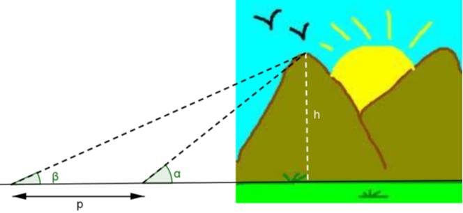 Uma técnica que permite a medição correta da altura é a seguinte: de um ponto no chão, mede-se o ângulo de elevação do chão do topo da montanha (?); caminha-se um valor conhecido de metros para trás (p); mede-se novamente o ângulo de elevação do chão ao topo da montanha (?).