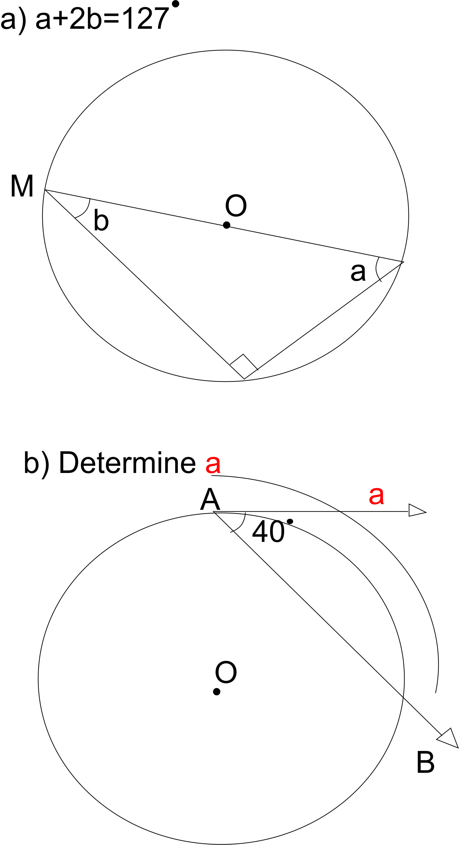 a)como o triangulo inscrito a circunferencia eh retangulo,logo a+b=90,como foi dado q. a+2b=127,eh resolver esse sistema,q. teremos como soluçao a=53,b=37...
