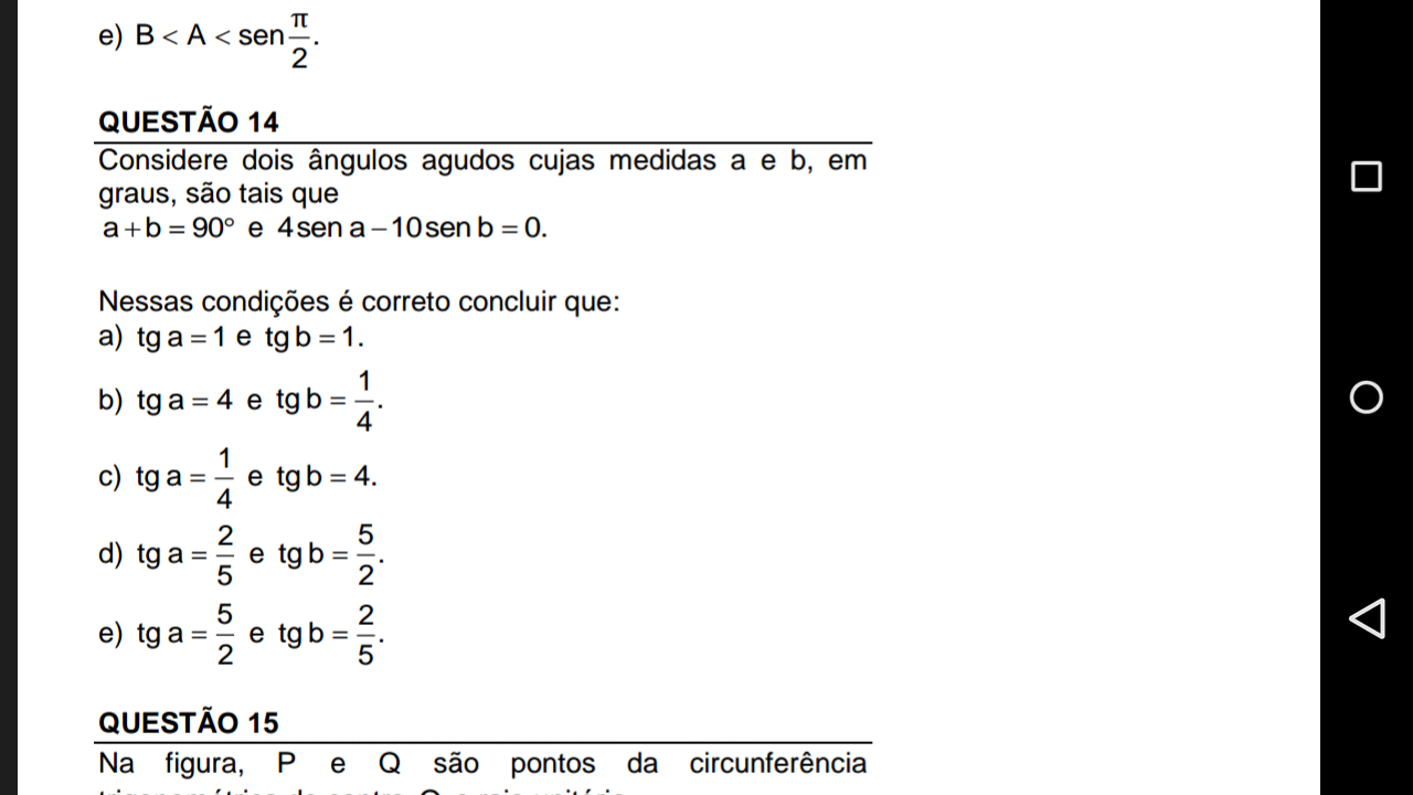 4senA-10senB=0. Evidencia-se, pois uma relação de igualdade a partir destes dois membros: 4senA=10senB. Por outro lado, temos que saber deles serem de ângulos diferentes pela ocasião de haver: A e B. Avalia-se, a falta do cosseno para estabelecer as tangentes, logo estamos percebendo está numa Relação Fundamental!