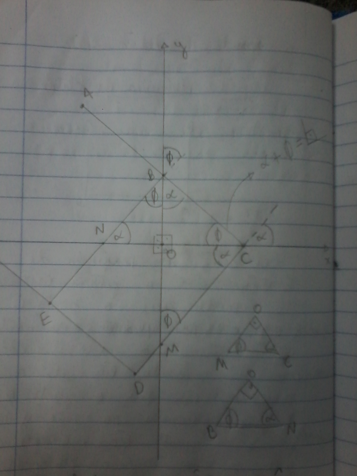 Mas, olha, no primeiro triangulo (o OMC) o segmento oposto ao angulo alpha é o segmento OM enquanto que no segundo triangulo (o BON) o segmento oposto ao ângulo alpha é o OB. Não é um lado de um triângulo no numerador da fração e o outro lado correspondente no denominador? Se for isso, a fração fica: