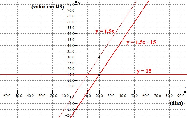 Pense em um gráfico que relaciona "dias" no eixo das abscissas (eixo x) e "R$" no eixo das ordenadas (eixo y).