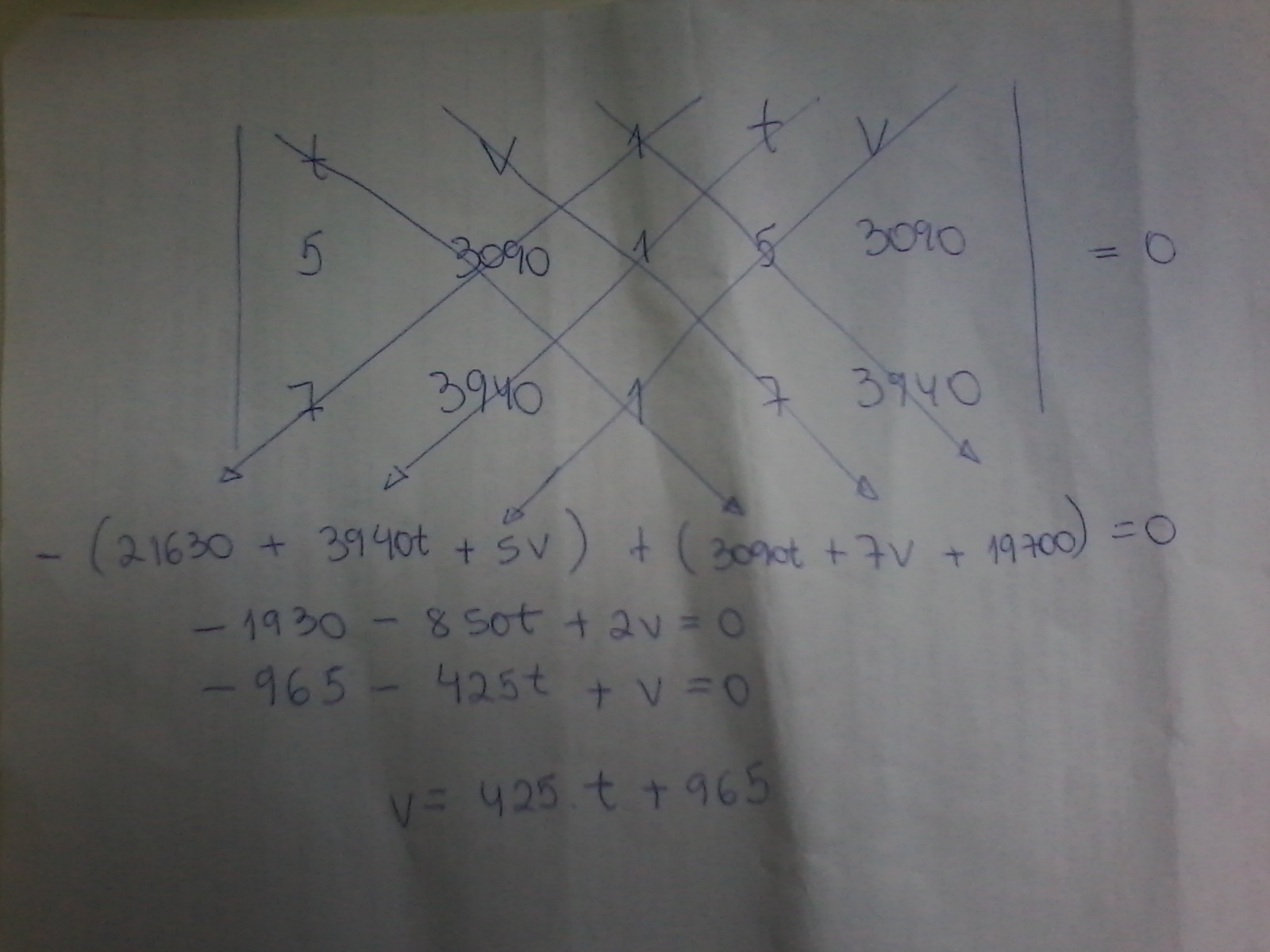 Peguei os pontos (5 segundos - 3090 cm/s) e (7 segundos - 3940 cm/s) e montei a equação geral da reta (da segunda parte da reta do gráfico), através do cálculo de determinante: