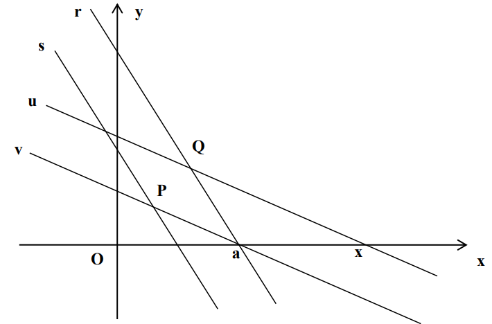 No plano cartesiano abaixo, estão representadas as retas r, s, u e v, com r//s e u//v. A reta s corta o eixo das abscissas no ponto (2 , 0), assim como a reta v em (a , 0) e a reta u em (x , 0), em que 2 < a < x. P é o ponto de interseção entre as retas s e v e Q, entre as retas r e u. A reta PQ passa pela origem do plano cartesiano. O valor de x é:
