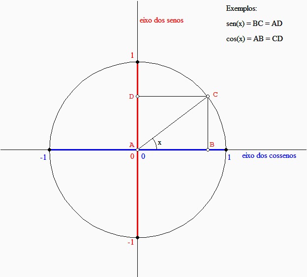 Sobre sua outra dúvida, imagine o ponto C se movimentando sobre a circunferência e observe como se comportam as medidas para seno e cosseno.