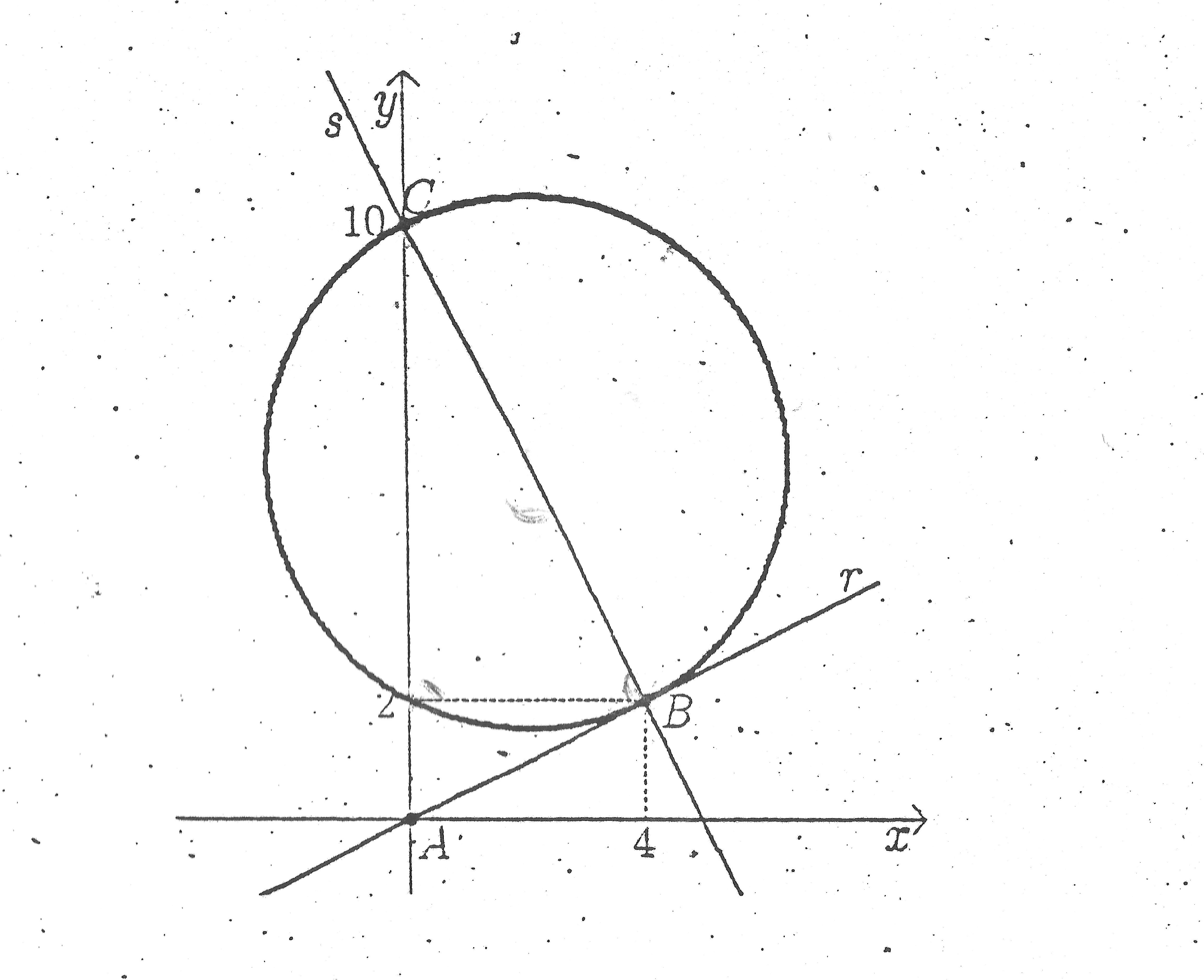 O enunciado é o seguinte: Na figura abaixo considere o circulo que contem os pontos B(4,2) , C(0,10) e D(0,2), a reta r é tangente ao circulo em B e s é uma reta que passa por B e C. Qual a área da regiao interna ao circulo limitada entre o eixo y e a reta s?