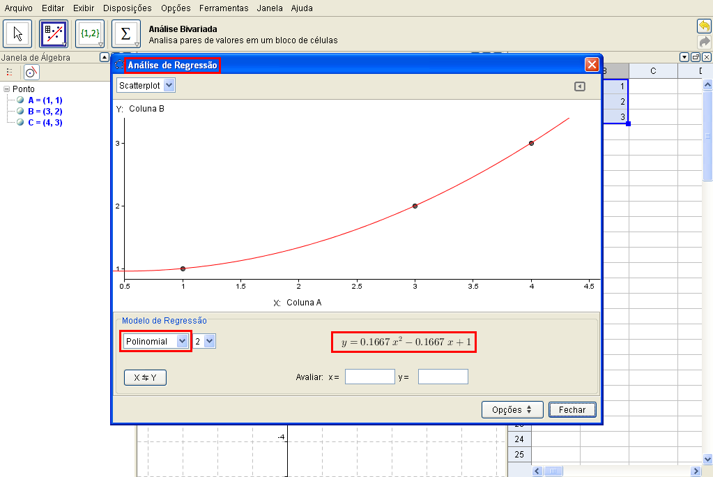Note que o programa GeoGebra é capaz de descobrir vários gêneros de funções que passam (ou que pelo menos se aproxima) dos pontos dados no plano.