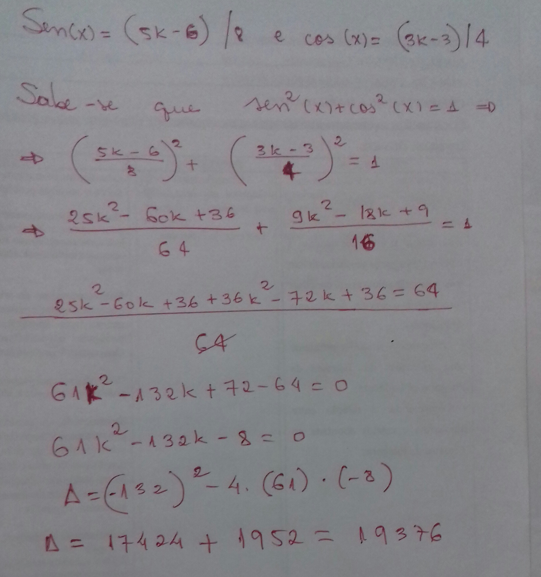 Dada a expressão: sen(x)=(5k?6)/8 e cos(x)=(3k?3)/4, ache o valor de k: