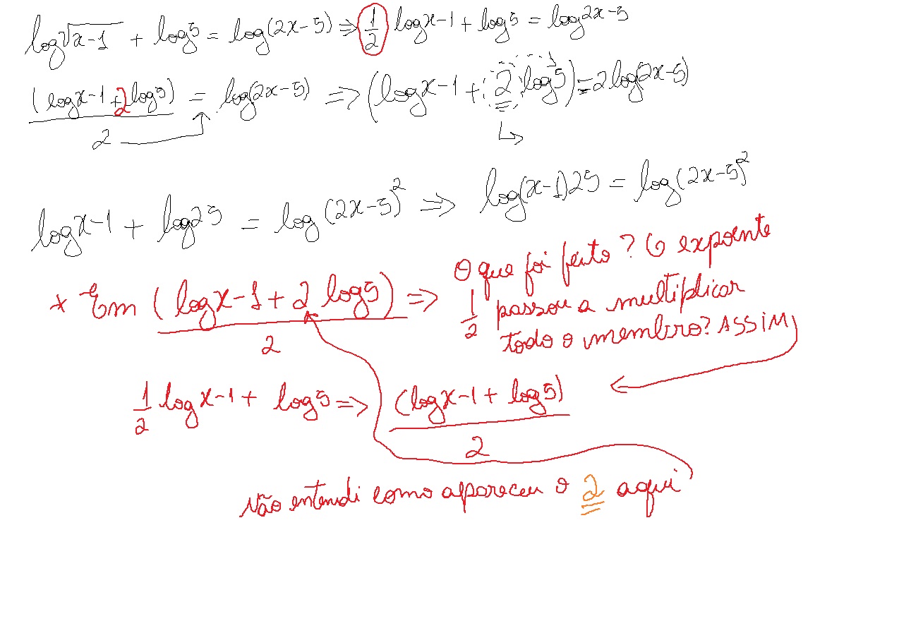 vc sabe somar fraçoes,entao ...(a/2)+b=c...(a+2.b)/2=c...a+2.b=2c,foi isso q. usei na passagem q. vc grifou,estude soma de fraçoes e etc,volte la e refaça(exercicio)...agora,por ultimo na soluçao ...a resposta e 10(esqueci de ver o dominio da expressao)...entao vamos la...y=log x,e definida para
