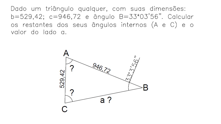 Vejo que para esse calculo ser possível eu deveria saber 2 lados do triangulo e o angulo que é dado pela vértice formada por esses dois lados, nessa questão seria o angulo A,mostrado na figura, e não o B, que é o existente.
