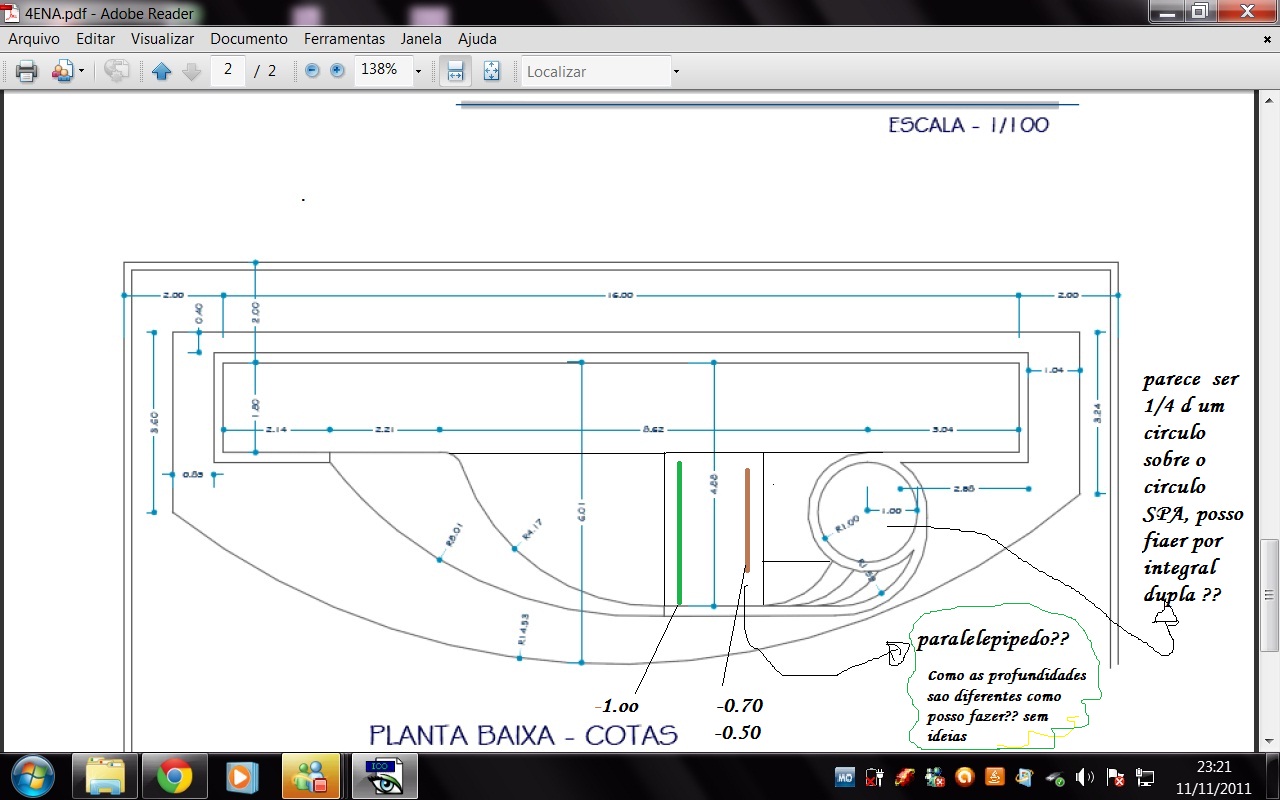 tenho que achar o volume de uma planta de uma piscina com profundidades diferentes. Dividir a mesma em figuras geométricas, a parte de cima (raia) fiz com a area de um paralelepipédico (pois como tem profundidades diferentes por integral quando rotaciono nao fica como um cilindro, pois tem profundidade de 1m e outro d 1.50). Logo a baixo tem 1/4 de um circulo ( c=