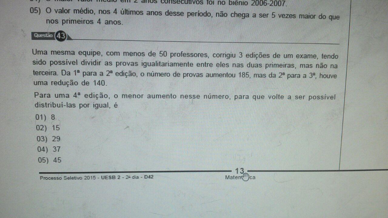 Na quarta para poder haver divisão igualitária precisaremos que o n. de provas sejam um múltiplo de 37. Portanto 37.2 =74 mas como tínhamos 45 provas o número acrescentado para chegar aos 74 será de 74 - 45 = 29