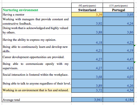 A dúvida é a seguinte: Tenho estes dois grupos de resultados (ver imagem) em que em cada célula apresenta-se o valor médio das respostas dos participantes (era uma escala de Likert de 0 a 5) para cada item. E no final tenho as duas médias totais para cada país. Gostaria de saber se é possível comparar estatisticamente se a diferença das médias totais obtidas é significativa?