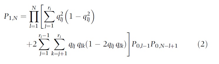 A probabilidade(P1,N) que os indivíduos A e B, genotipados para N marcadores, possuam o mesmo genótipo para todos, exceto 1 marcador ao acaso é (fórmula 2 em anexo)