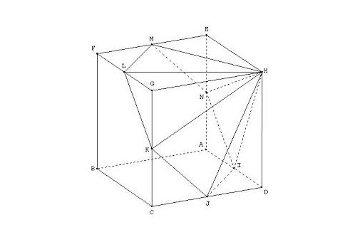 Na figura abaixo, temos um cubo ABCDEFGH de aresta a = 6 cm. Os pontos I, J, K, L, M e N são pontos médios das