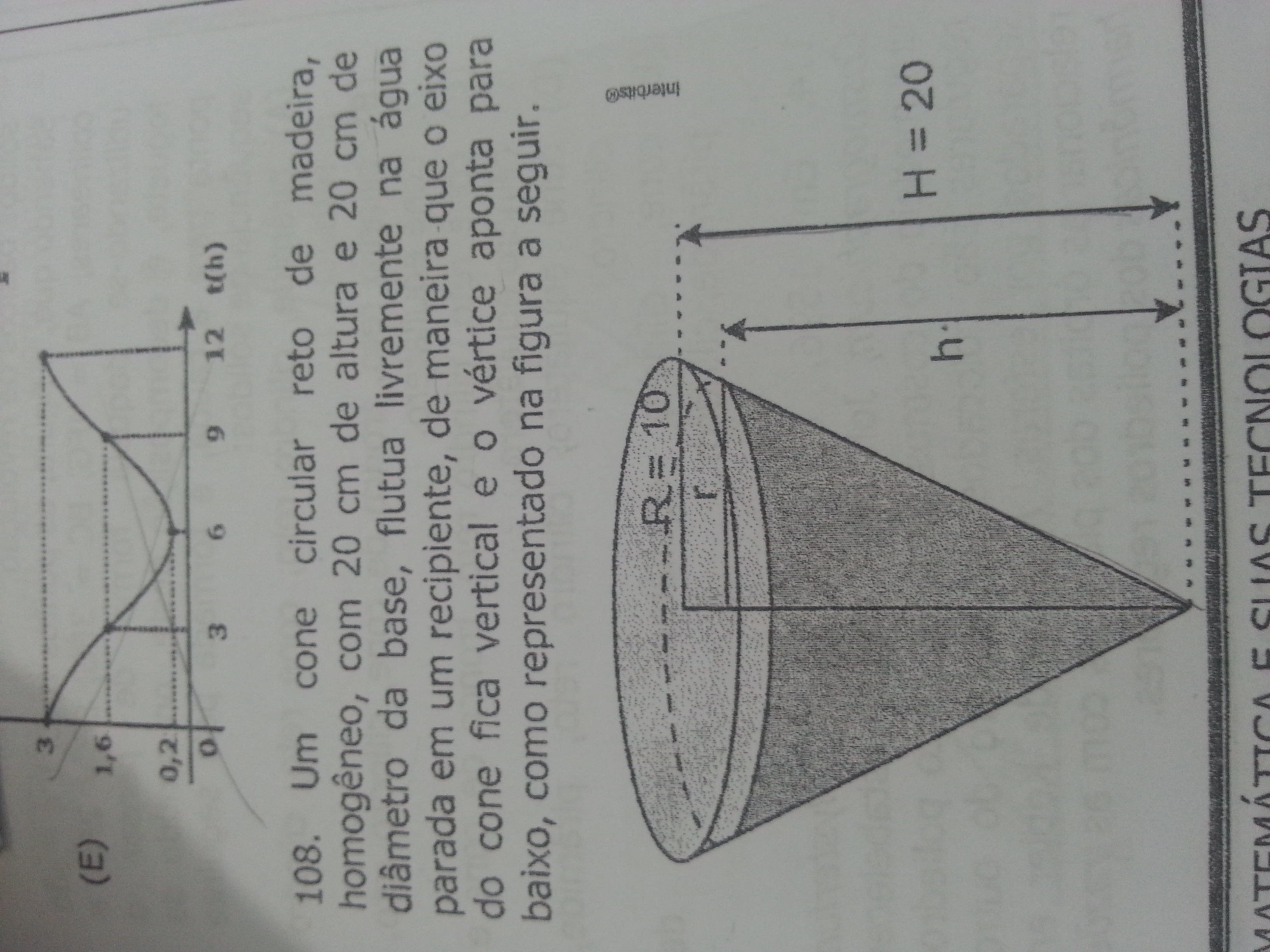 - Denotando-se por -h- a profundidade do vértice do cone, relativa à superfície da água, por -r- o raio do círculo formado pelo contato da superfície da água com o cone e sabendo-se que as densidades da água e da madeira são 1 g/cm3 e 0, 6 g/cm3, respectivamente, os valores de R e H , em centímetros, são, aproximadamente: