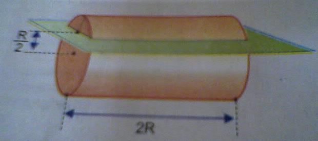 Um cilindro circular reto, de raio R e altura h = 2R, é cortado por um plano paralelo ao seu eixo. Sendo R/2 a distância do eixo ao plano secante, calcule o volume do menor segmento cilíndrico resultante desta secção.