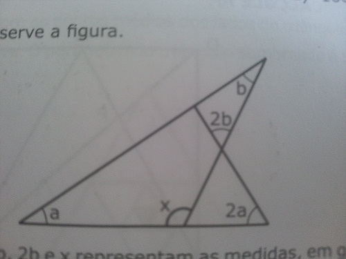 Nela, a,2a,b,2b e x representam as medidas, em graus, dos ângulos assinalados. O valor de x, em graus, é
