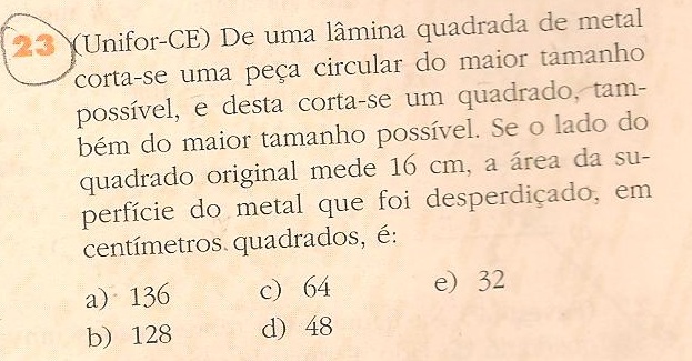 tamanho possível. Se o lado do quadrado original mede 16 cm, a área da superfície do metal que foi desperdiçado, em centímetros quadrados, é: