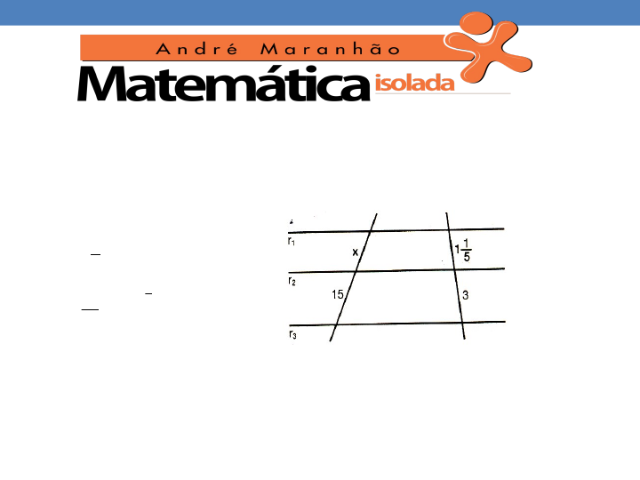 bmachado escreveu:As retas r 1 , r 2 e r 3 são paralelas e os comprimentos dos segmentos de transversais são indicados na figura. Então x é igual ...