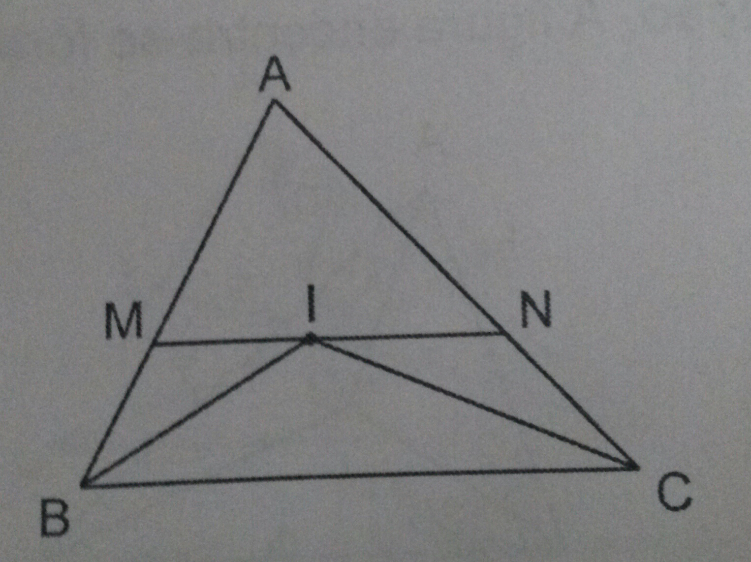 O ponto I é o incentro do triângulo ABC a seguir. Os pontos M, I e N estão alinhados e MN//BC.