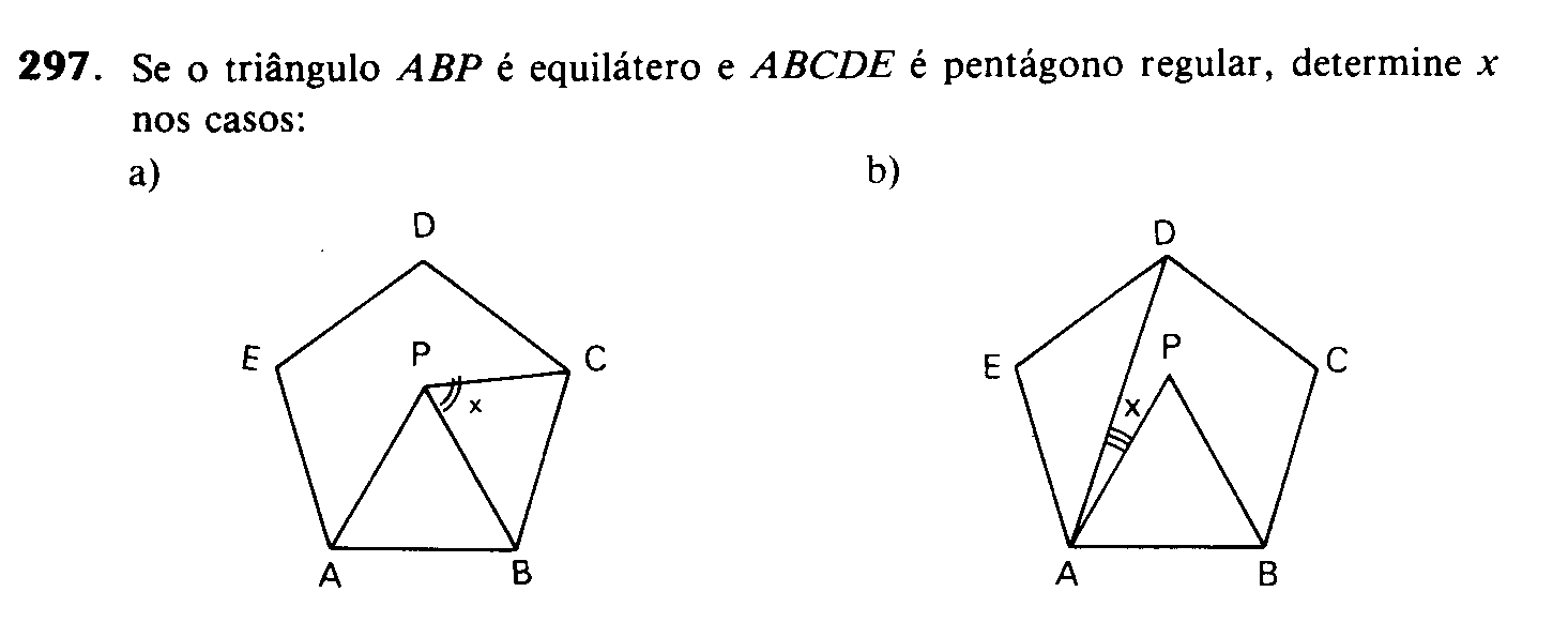 Estou uma uma duvida na letra A... porque eu até achei o resultado explicar aqui. A soma do angulos interno do pentagono regular é 540° tudo bem até aqui. na questão fala que ABP é equilatero os angulos interno tem 60° cada ... 540/5 dará 108° cada angulo do pentagono então se ABP é equilatero o outro angulo do outro trinagulo será 48°. OK até aqui mais queria saber se a Pc é igual a PC pois no livro a resposta fica 2x+48=180 resultado 66° mais eu não entedi o porque os dois angulos do triangulo que não é equilatero vale x +x+48.porque acho que não é equilatero!